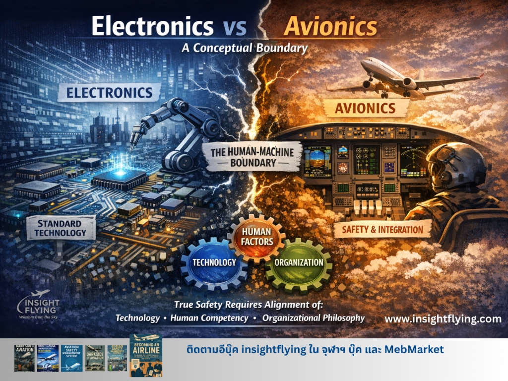 บทนี้มีวัตถุประสงค์เพื่ออธิบายความแตกต่างพื้นฐานระหว่าง electronics และ avionics ว่าทำไมความแตกต่างนี้จึงมีความสำคัญ และเหตุใดความเข้าใจหรือการจัดการ avionics ที่ไม่ถูกต้องจึงมีส่วนเกี่ยวข้องกับอุบัติเหตุและ serious incidents หลายเหตุการณ์ในโลกการบิน ผ่านกรณีศึกษาที่คัดเลือกมา จะเห็นได้ว่า “avionics failures” แทบไม่เคยเป็นปัญหาของเทคโนโลยีเพียงอย่างเดียว แต่เกือบทั้งหมดเกี่ยวข้องกับ system integration, human interaction และการตัดสินใจภายใต้แรงกดดัน