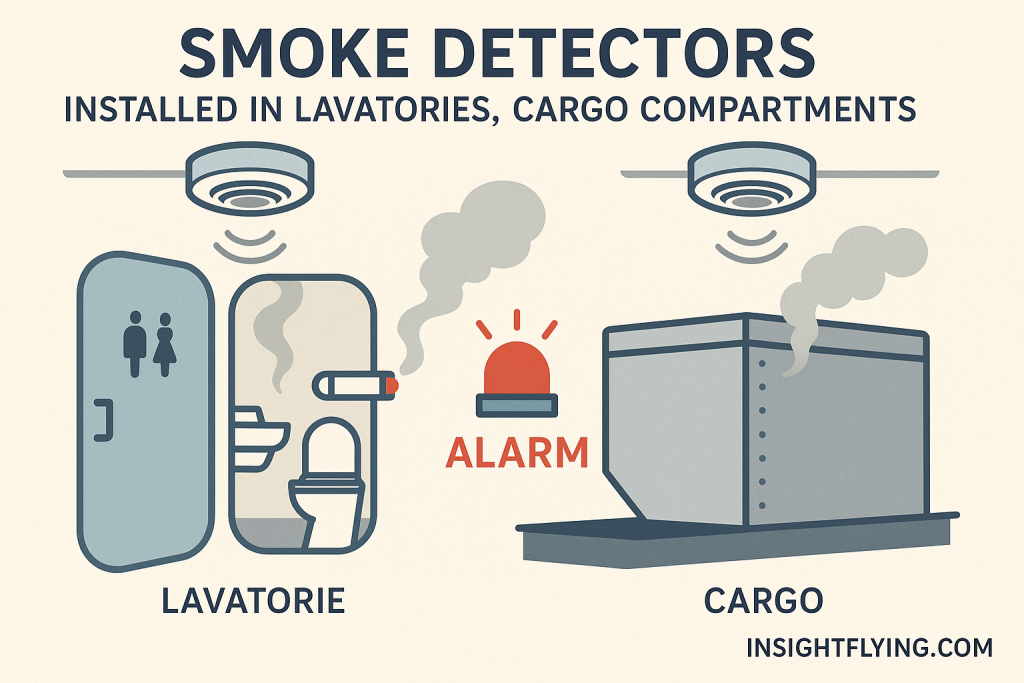 • Smoke Detectors – Installed in lavatories, cargo compartments, and sometimes cabin ceilings; detect smoke particles in the air.